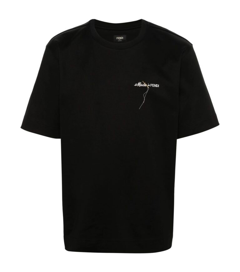 Made in Fendi, camiseta negra de algodón con bordado en el pecho. Incluye un motivo de aguja e hilo, lo que le da un toque elegante y distinto