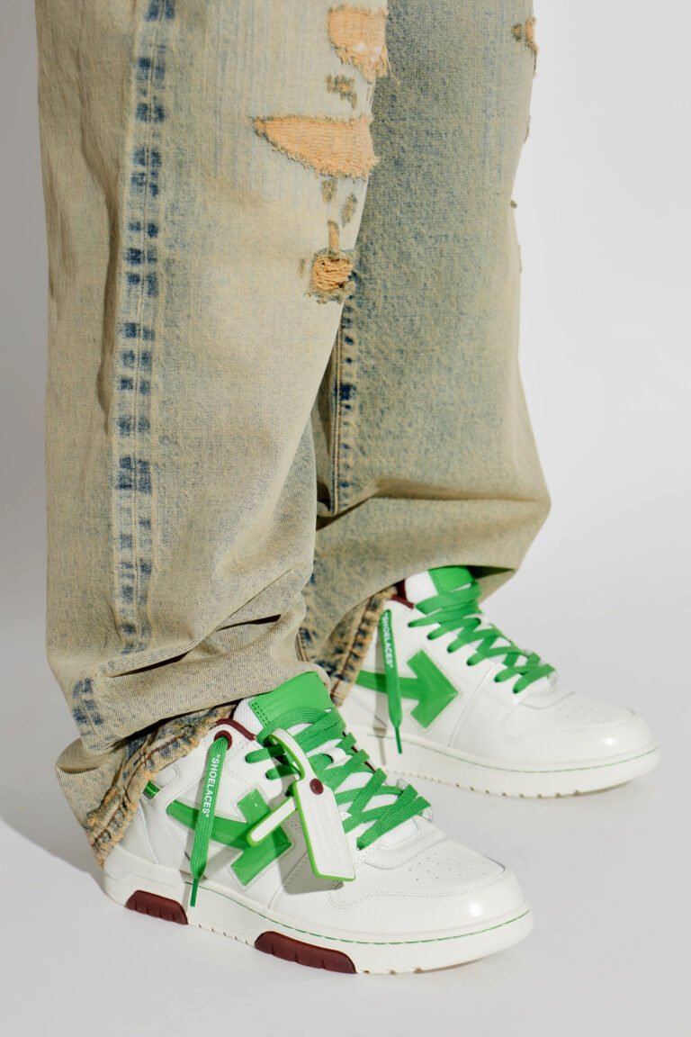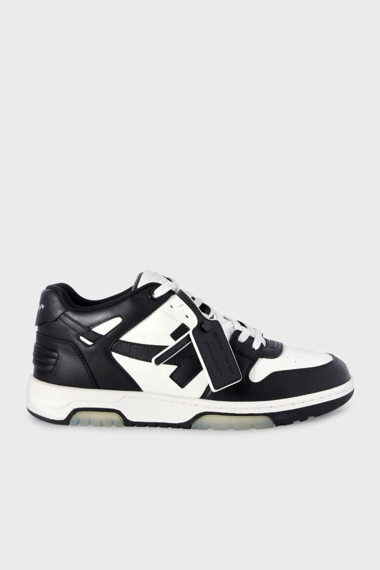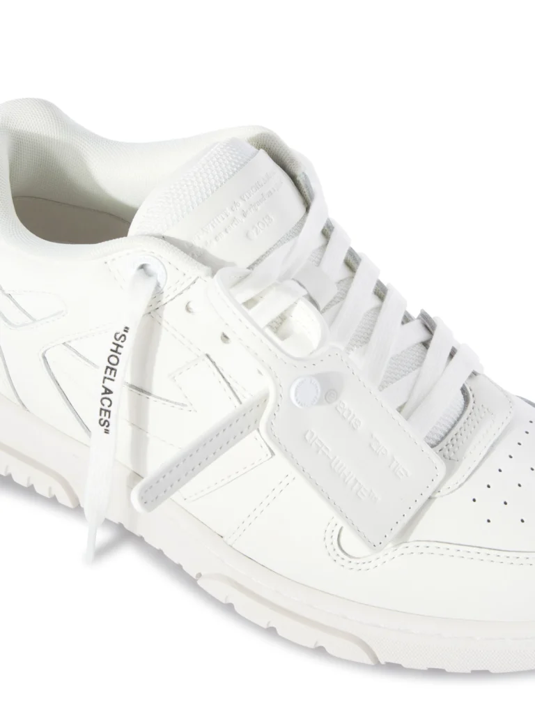 Las Off-White Out of Office en cuero blanco con paneles metálicos plateados combinan detalles retro con un diseño urbano. Incluyen el logotipo de flecha de la marca, suela de goma translúcida y lengüeta acolchada, ofreciendo estilo y comodidad para uso casual.
